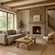 Уютные акценты – камин, мягкая мебель, ковры, теплый текстиль.
